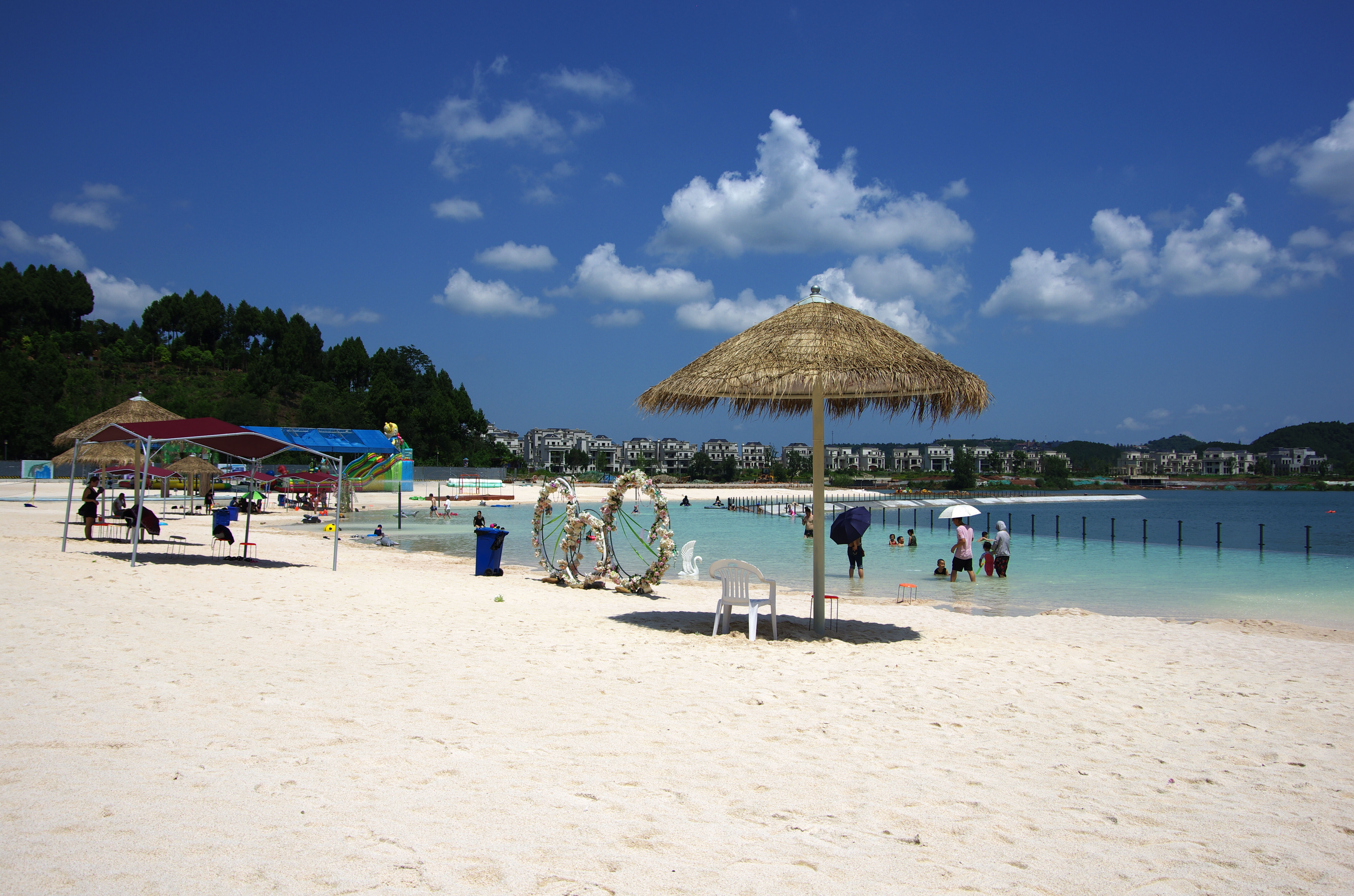 綿陽嘉成文化旅游有限公司是一家旅游開發(fā)公司,成立于2019年。 親水灣沙灘樂園項目由綿陽嘉成文化旅游有限公司開發(fā)運營,位于國家級水利風景區(qū)——綿陽市仙海水利風景區(qū),距綿陽市區(qū)15公里,車程約半個小時,是依托沉抗水庫建設的仙海風景區(qū)重點旅游項目。進入仙海風景區(qū)上坡向左進入環(huán)湖路前行1000米。項目總占地220畝,其中核心沙灘樂園占地100畝,現(xiàn)建成沙灘休閑、淺灘嬉水、水上運動,親子蹦蹦云、網(wǎng)紅多人秋千、人力過山車、水幕秋千、團隊拓展等項目十余個,還開設有特色中餐、仙海火鍋魚,自助燒烤等飲食項目。 近觀青山綠水,遠眺碧波蕩漾,清晨朝霞映翠、傍晚水天一色。親水灣沙灘主題樂園有可容納200人的沙灘會議室和30人的小型會議室;棋牌室16間; 商務KTV;餐飲中心可同時容納300人用餐;篝火晚會場地等,是婚禮壽宴、同學聚會、餐飲娛樂、商務會議、拓展培訓、家庭親子活動的首選之地。